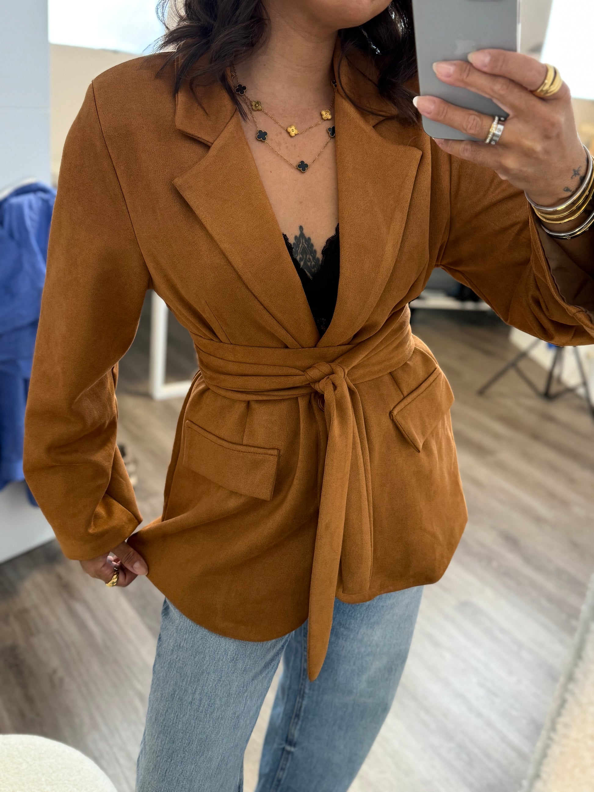 Este blazer de efecto antelina es el accesorio perfecto para añadir estilo a cualquier outfit. Con un estilo oversize y una lazada como cinturón para la cintura, este blazer ofrece versatilidad para un look elegante o casual. Haz una declaración de moda con Blazer Antelina.