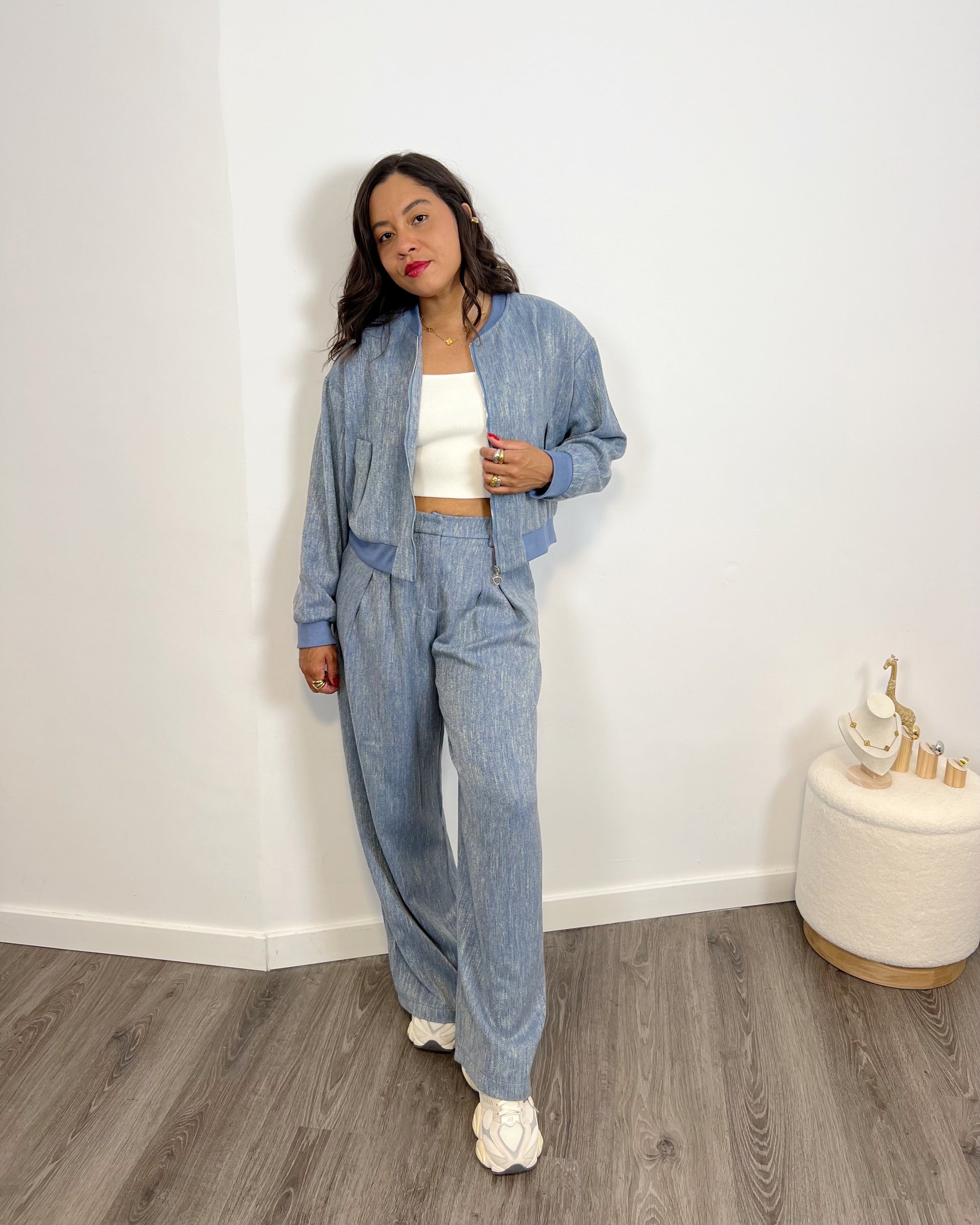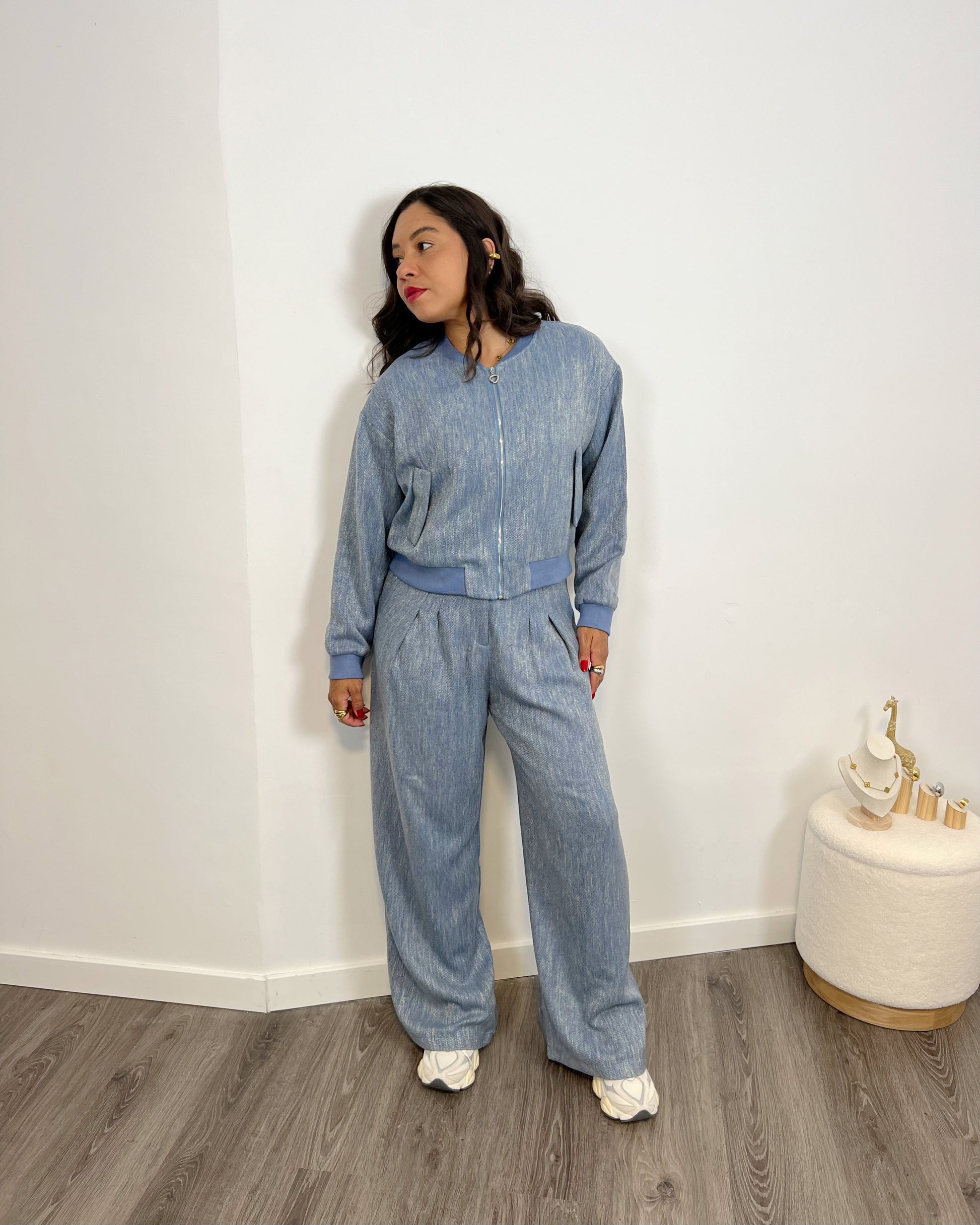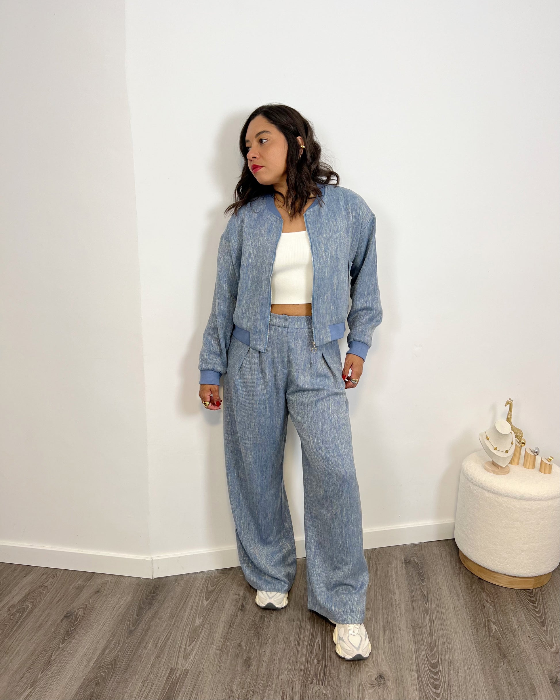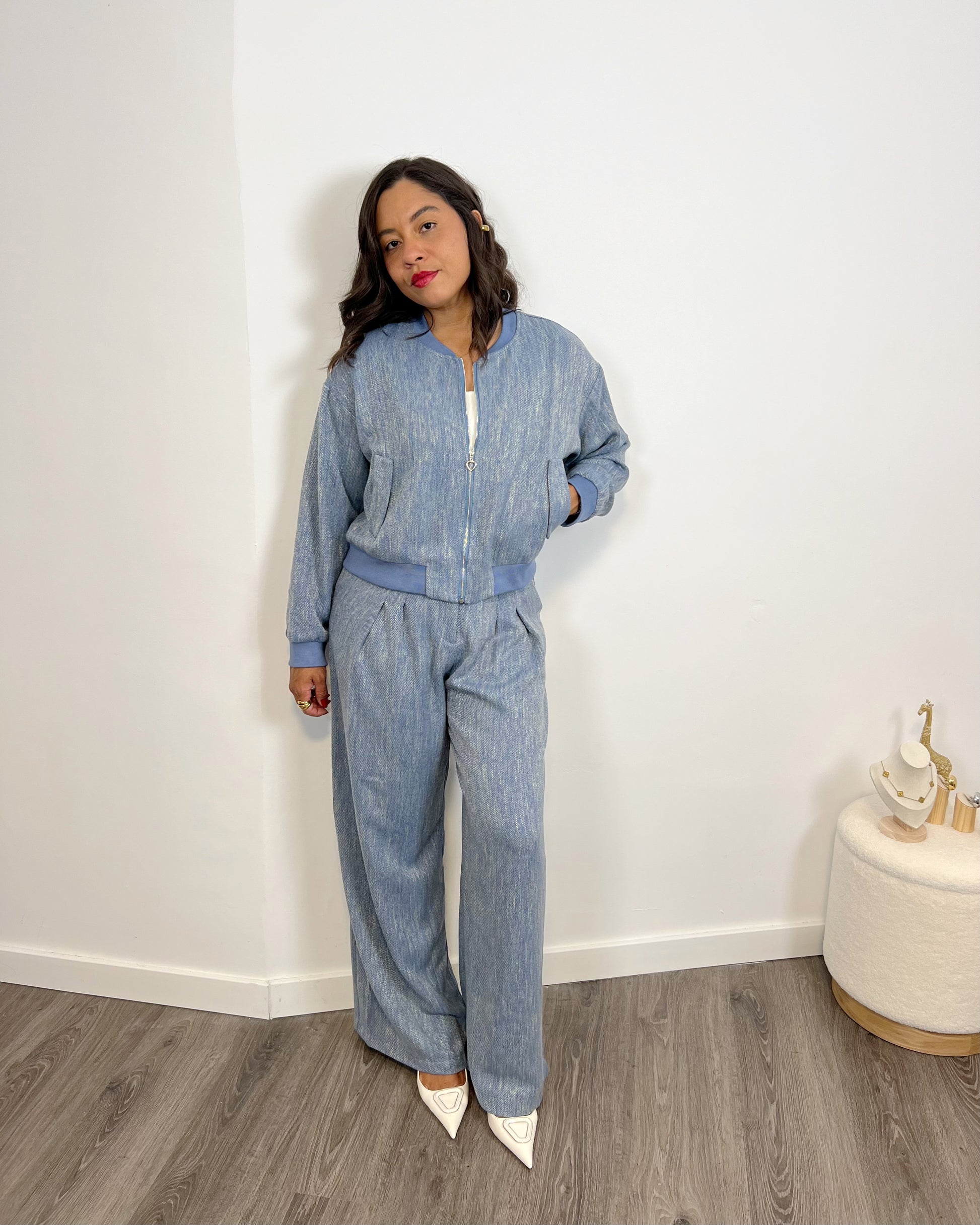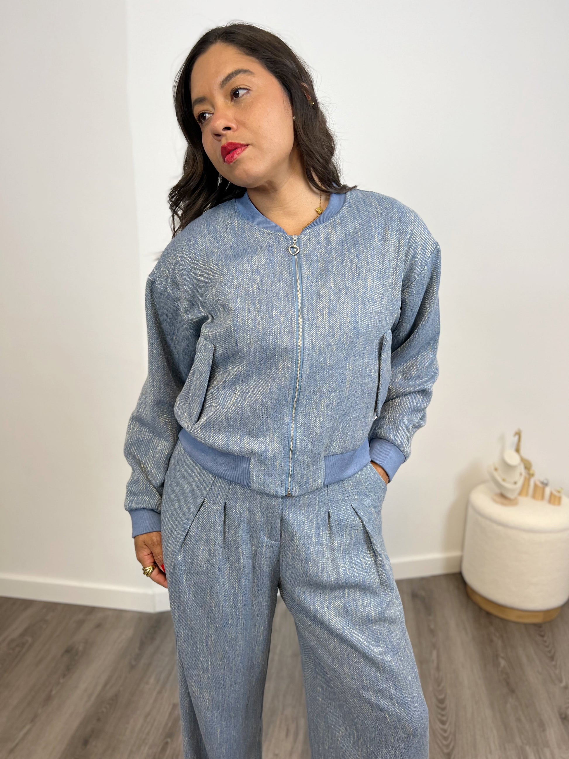 Nuestra Bomber Océano es el complemento perfecto para tus looks elegantes y casuales. Confeccionado en un tejido de alta calidad de algodón y viscosa, su diseño en color azul con raspeado plateado te dará un toque único y versátil. Haz una declaración de estilo con este bomber.