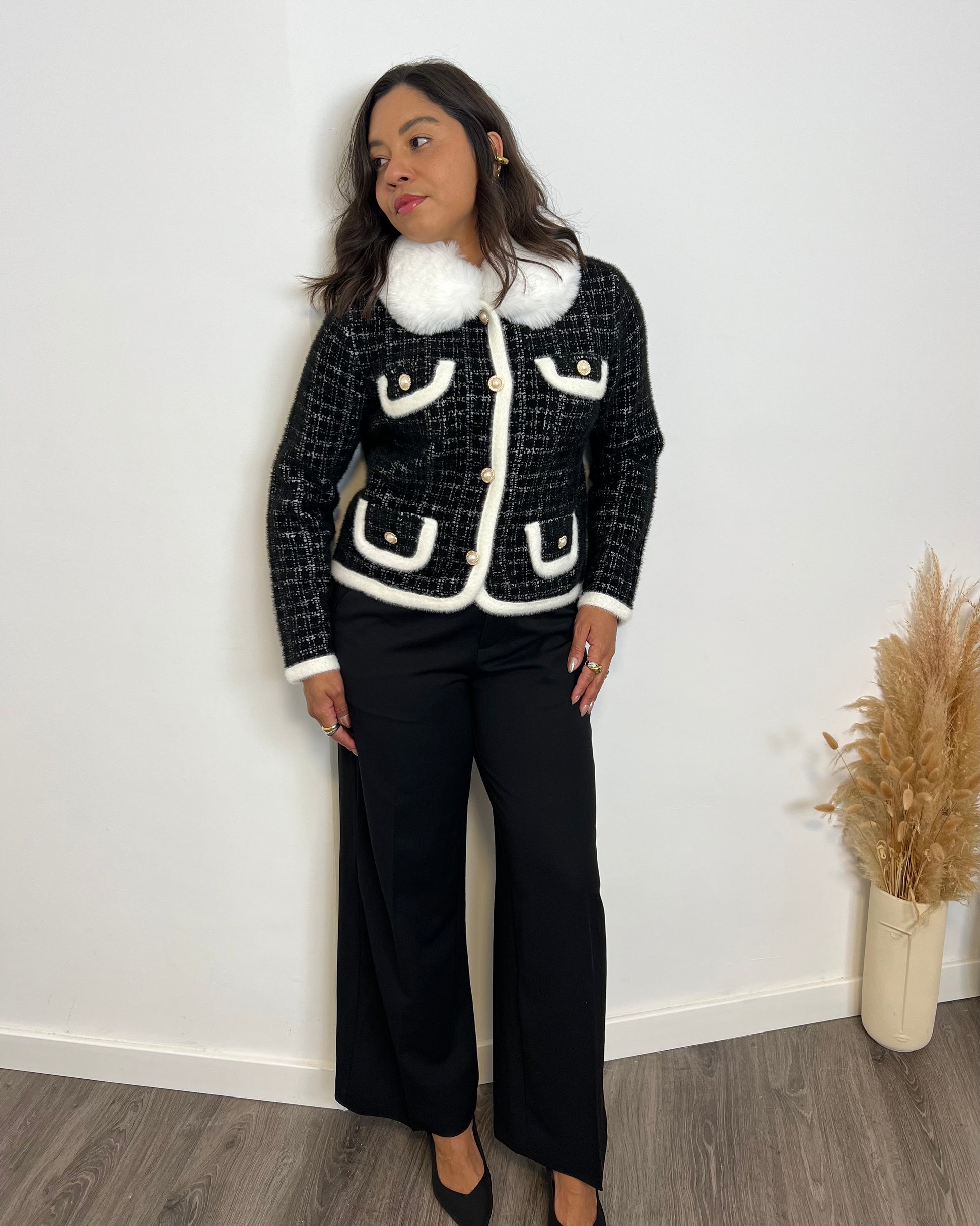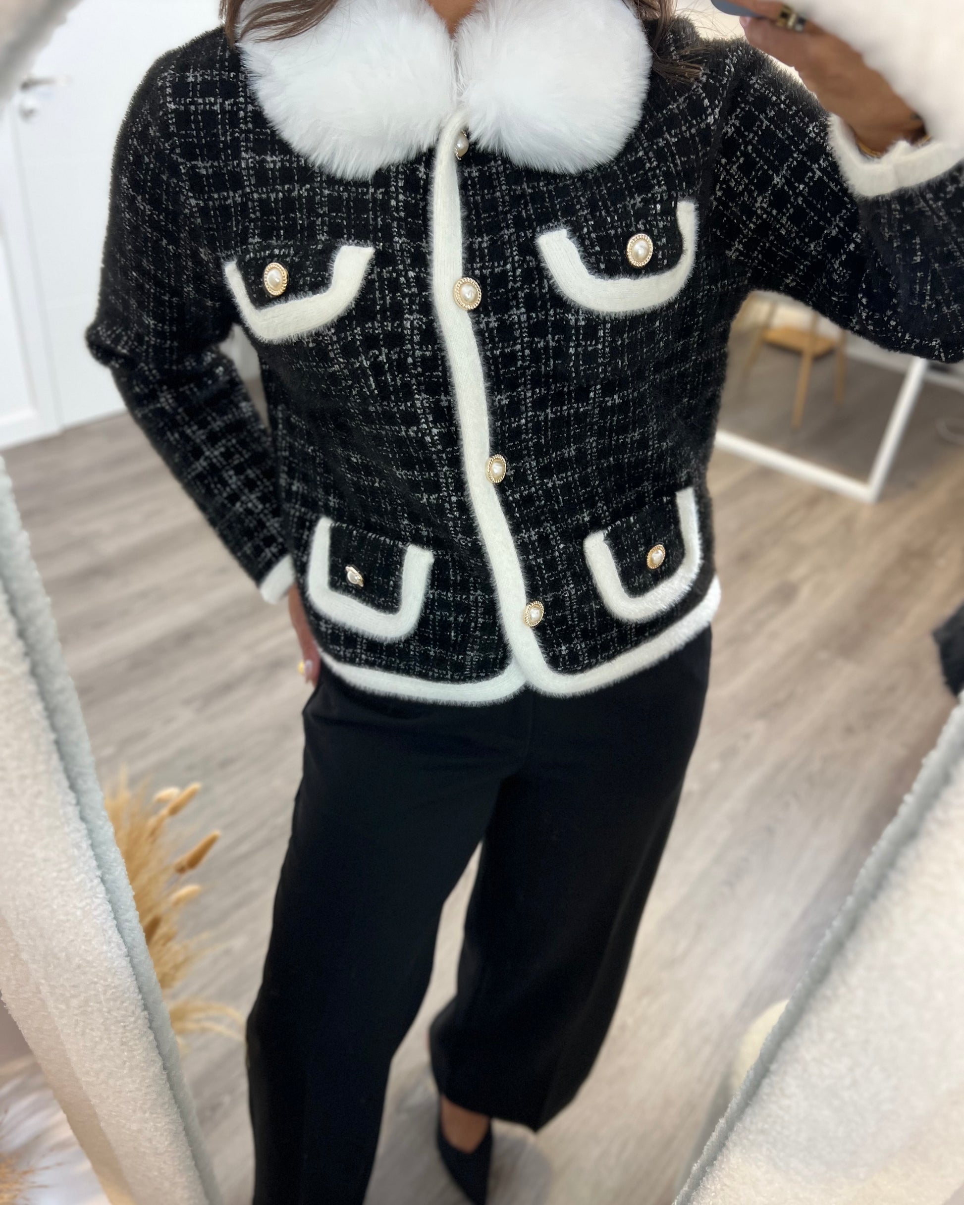 La chaqueta Celine es una prenda sofisticada que ofrece versatilidad y estilo. Con su elegante diseño en blanco y negro y su cuello de pelo desmontable, esta chaqueta es ideal para cualquier ocasión. La calidad de su confección te asegura una prenda duradera y de alta gama.