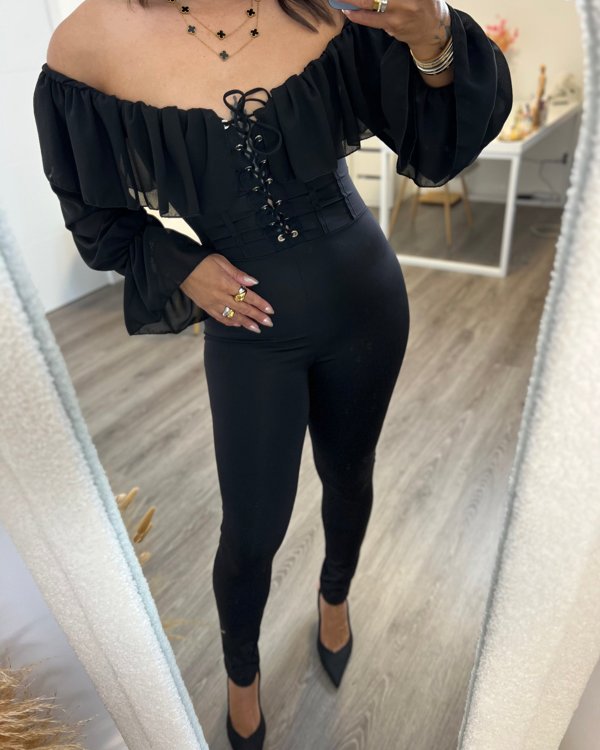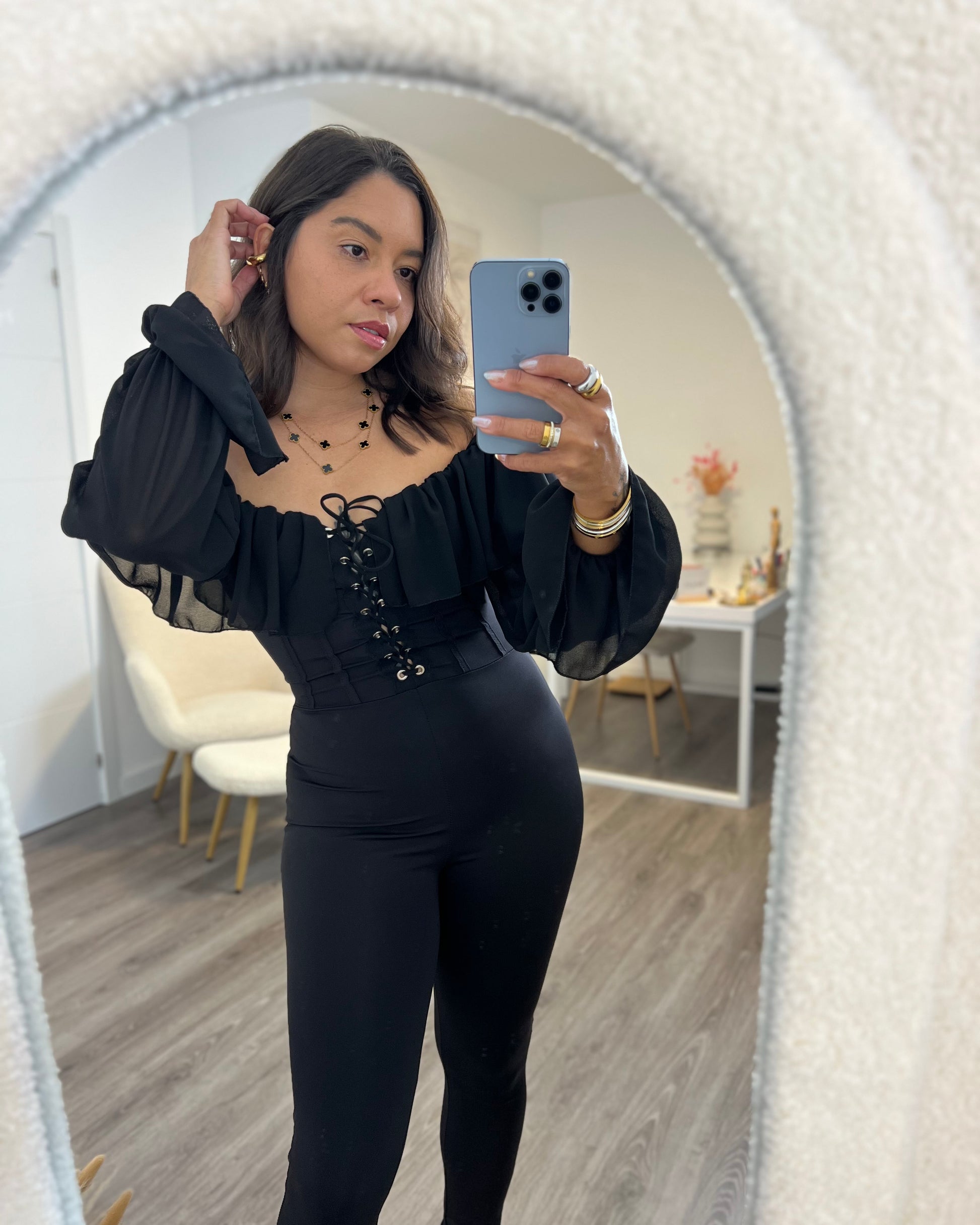 Este Mono Kim es perfecto para una silueta ajustada gracias a su tejido de licra. El encaje le da un toque de elegancia y estilo. Ideal para cualquier ocasión, con su diseño moderno y cómodo.
