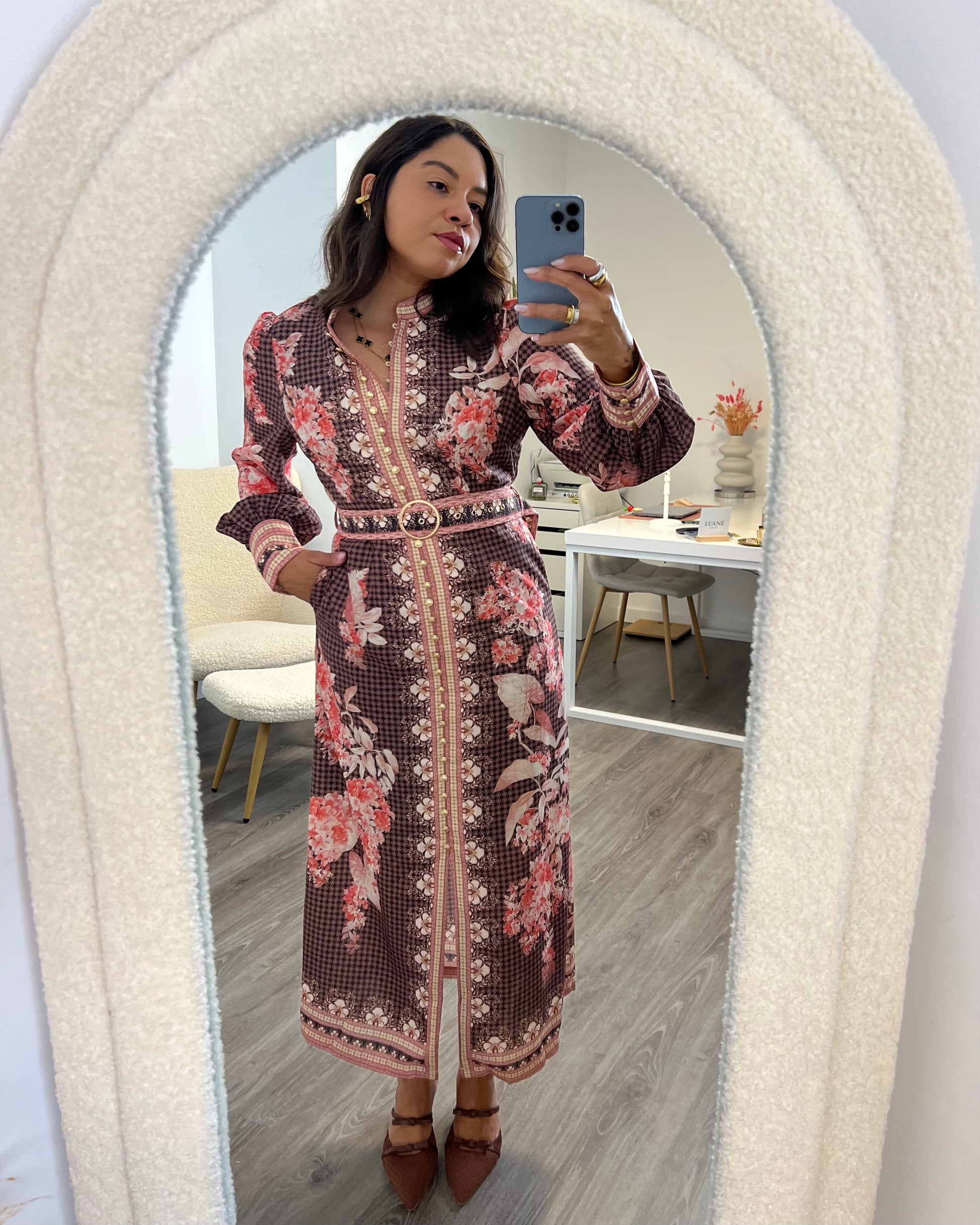 Disfruta de la elegancia y comodidad con este vestido Troya. Con su largo y estampado floral en tonos marrones y rosa, te sentirás hermosa y segura. Los botones dorados añaden un toque de lujo a este vestido. Perfecto para una ocasión especial o una tarde en la ciudad.